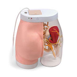 Intramuscular Injection Model This high-tech medical model with realistic skin is perfect for teaching proper injection techniques and how to avoid nerves and veins. The see-through right side of the model shows internal structure including bones, muscles, nerves and veins. Correct intramuscular injection sites can be palpated. A green light indicates correct injection technique and positioning - a buzzer and flashing red light warn students if they have gone too deep or needle position is incorrect. Dimensions: 15" H x 13-3/4" W x 8-1/2" D. One-year warranty.